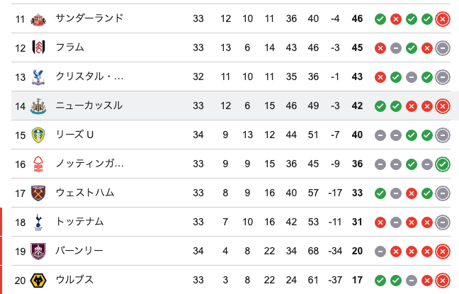 対戦相手のニューカッスルは33戦12勝15敗6分で現在14位と思いのほか下位…