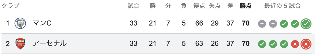 ちなみに宇宙王者シティとは勝ち点で並び、得失点差はわずか3。